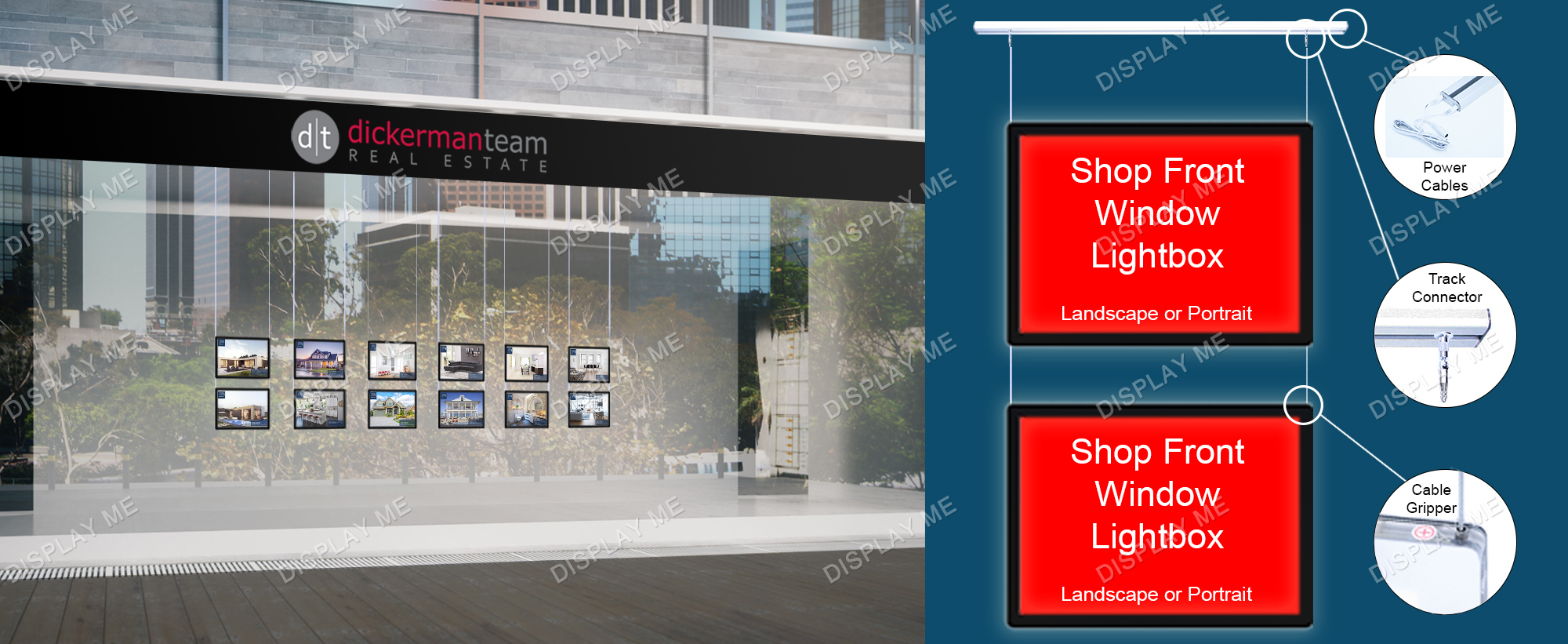This LED Illuminated Window Light Box Display is ideal for Real Estate Windows, Corporate Offices, Clubs and Brand Promotions. These LED Illuminated Cable Light boxes can be displayed on both sides and give your promotions the attention they need. Each displayed poster is individually covered with a acrylic frame and illuminated by LED giving it a modern elegant look that attracts attention. The posters can be easily changed by using the finger hole and lifting the cover.