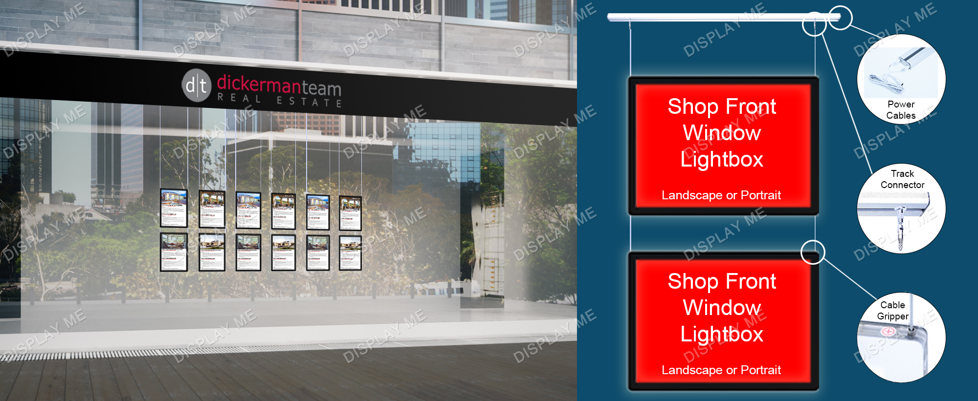 This LED Illuminated Window Light Box Display is ideal for Real Estate Windows, Corporate Offices, Clubs and Brand Promotions. These LED Illuminated Cable Light boxes can be displayed on both sides and give your promotions the attention they need. Each displayed poster is individually covered with a acrylic frame and illuminated by LED giving it a modern elegant look that attracts attention. The posters can be easily changed by using the finger hole and lifting the cover.
