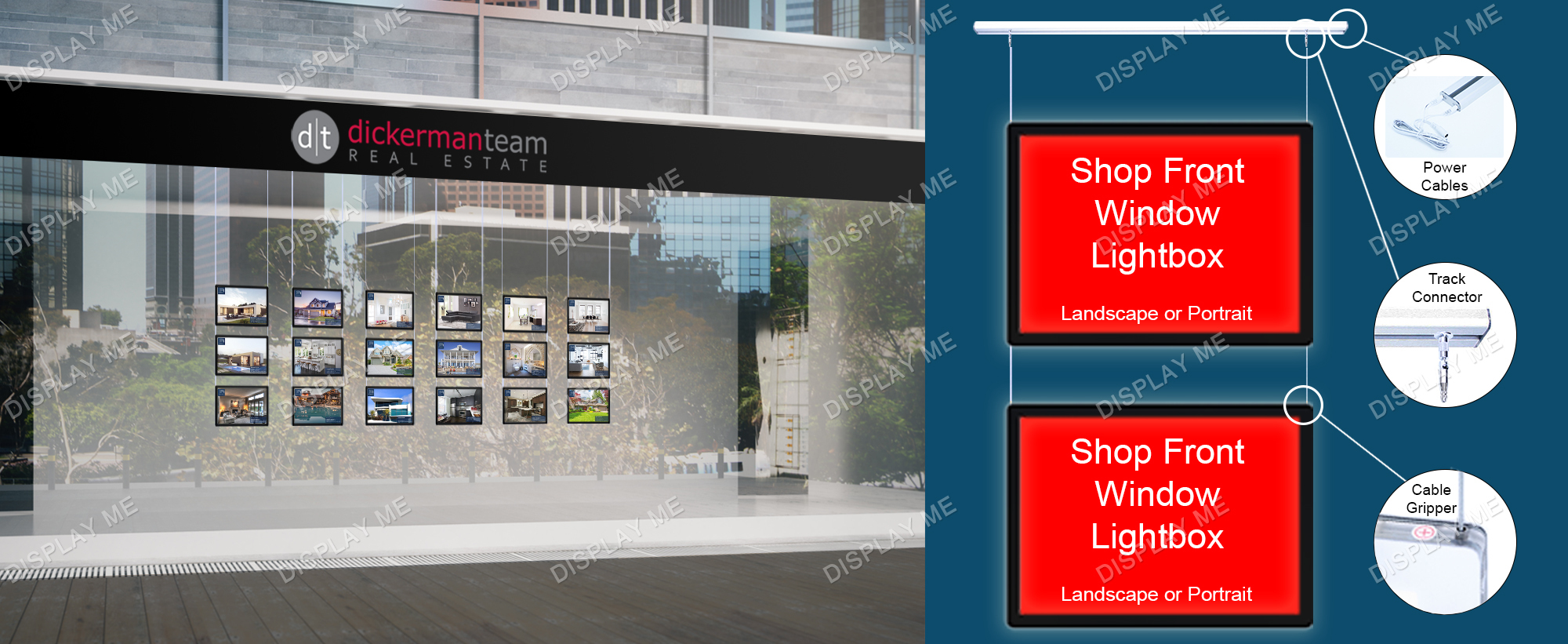 This LED Illuminated Window Light Box Display is ideal for Real Estate Windows, Corporate Offices, Clubs and Brand Promotions. These LED Illuminated Cable Light boxes can be displayed on both sides and give your promotions the attention they need. Each displayed poster is individually covered with a acrylic frame and illuminated by LED giving it a modern elegant look that attracts attention. The posters can be easily changed by using the finger hole and lifting the cover.