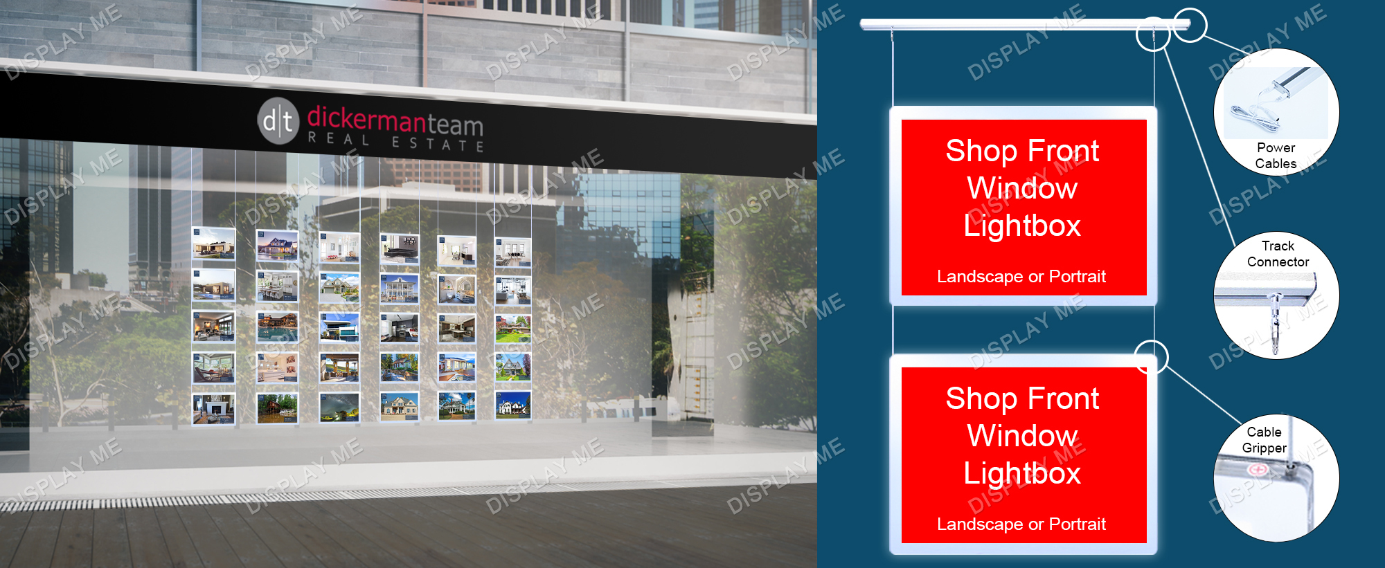 This LED Illuminated Window Light Box Display is ideal for Real Estate Windows, Corporate Offices, Clubs and Brand Promotions. These LED Illuminated Cable Light boxes can be displayed on both sides and give your promotions the attention they need. Each displayed poster is individually covered with a acrylic frame and illuminated by LED giving it a modern elegant look that attracts attention. The posters can be easily changed by using the finger hole and lifting the cover.