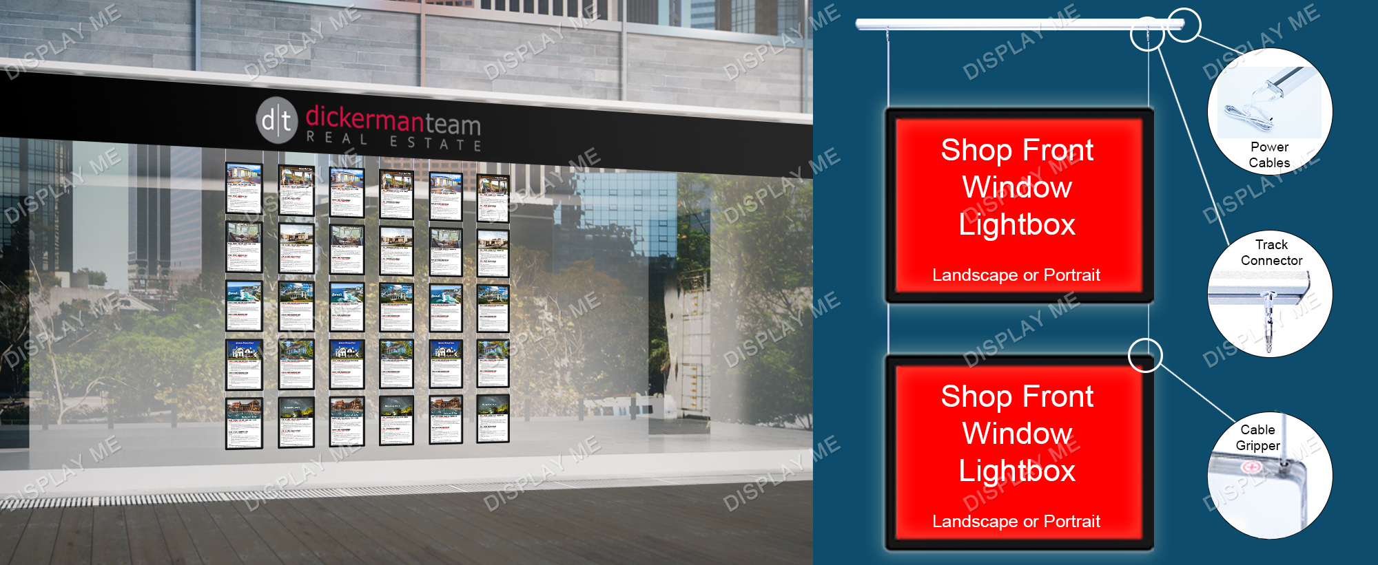 This LED Illuminated Window Light Box Display is ideal for Real Estate Windows, Corporate Offices, Clubs and Brand Promotions. These LED Illuminated Cable Light boxes can be displayed on both sides and give your promotions the attention they need. Each displayed poster is individually covered with a acrylic frame and illuminated by LED giving it a modern elegant look that attracts attention. The posters can be easily changed by using the finger hole and lifting the cover.