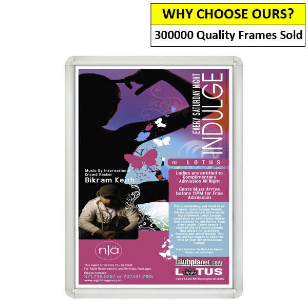 In StockThis silver thin round cornered A1 safety snap frame clips open from the front and around all four sides. The clip frame system makes changing graphics easier without having to remove the frame from the wall each time. These poster frames are also called snap frames or clip frames. They can be displayed in portrait or landscape orientation and come supplied with an anti-glare cover to protect your poster and with mounting hardware. They are ideal for advertising as well as general signage and can be used in a variety of indoor locations for a smart, professional look for your businesses signage.