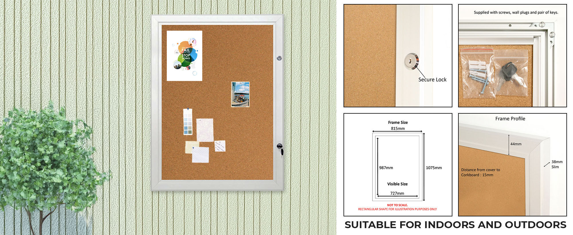 This notice board is rain-resistant, not waterproof. While it is outdoor-rated and suitable for use in sheltered outdoor areas, heavy or prolonged rainfall, flooding, water immersion, or extreme weather may cause moisture ingress and damage to the cork backing or internal components.