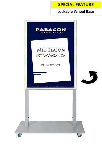 In StockThe Mall Stand is a portable display stand. This is a Double Sided Silver freestanding stand with a A1 Poster Display on both sides. It is sturdy and made of Steel and powder Coated in Silver. It is 143cm high which enables you to easily look over it to see beyond the line of sight. The frame is a tamper proof snap frame with a steel backing. The frame remains locked unless bottom, sides then top profiles are opened sequentially. The base is a low profile lockable wheel base that has removable wheels. They are ideal for venues and shopping malls to advertise or promote events. They can be used in a variety of indoor or under cover locations for a smart, professional look for your businesses signage and promotions.