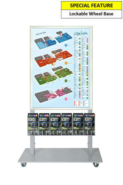 In StockThe Mall Stand is a portable display stand. This is a Single Sided Silver freestanding stand with a A1 Poster Display and 6 DL Brochure Holders. It is sturdy and made of Steel and powder Coated in Silver. It is 143cm high which enables you to easily look over it to see beyond the line of sight. The frame is a tamper proof snap frame with a steel backing. The frame remains locked unless bottom, sides then top profiles are opened sequentially. The Acrylic Brochure holders are scratch resistant and have a glass like appearance. The base is a low profile lockable wheel base that has removable wheels. They are ideal for venues and shopping malls to advertise or promote events. They can be used in a variety of indoor or under cover locations for a smart, professional look for your businesses signage and promotions.