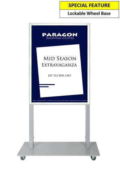 In StockThe Mall Stand is a portable display stand. This is a Single Sided Silver freestanding stand with a A1 Poster Display. It is sturdy and made of Steel and powder Coated in Silver. It is 143cm high which enables you to easily look over it to see beyond the line of sight. The frame is a tamper proof snap frame with a steel backing. The frame remains locked unless bottom, sides then top profiles are opened sequentially. The base is a low profile lockable wheel base that has removable wheels. They are ideal for venues and shopping malls to advertise or promote events. They can be used in a variety of indoor or under cover locations for a smart, professional look for your businesses signage and promotions.