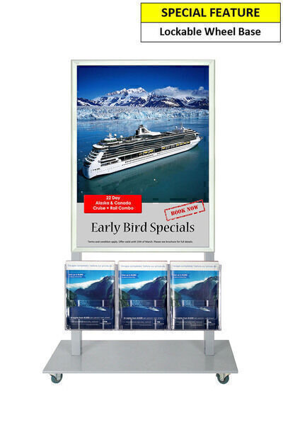 In StockThe Mall Stand is a portable display stand. This is a Single Sided silver freestanding stand with A1Snap Frame and 3 A4 Brochure Holders. It is sturdy and made of Steel and powder Coated in Silver. It is 143cm high which enables you to easily look over it to see beyond the line of sight. The frame is a tamper proof snap frame with a steel backing. The frame remains locked unless bottom, sides then top profiles are opened sequentially. The Acrylic Brochure holders are scratch resistant and have a glass like appearance. The base is a low profile lockable wheel base that has removable wheels. They are ideal for venues and shopping malls to advertise or promote events. They can be used in a variety of indoor or under cover locations for a smart, professional look for your businesses signage and promotions.
