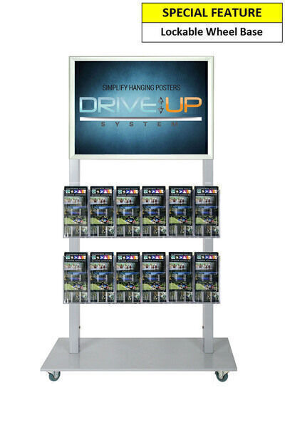 In StockThe Mall Stand is a portable display stand. This is a Single Sided Silver freestanding stand with a A2 Poster Display and 12 DL Brochure Holders. It is sturdy and made of Steel and powder Coated in Silver. It is 143cm high which enables you to easily look over it to see beyond the line of sight. The frame is a tamper proof snap frame with a steel backing. The frame remains locked unless bottom, sides then top profiles are opened sequentially. The Acrylic Brochure holders are scratch resistant and have a glass like appearance. The base is a low profile lockable wheel base that has removable wheels. They are ideal for venues and shopping malls to advertise or promote events. They can be used in a variety of indoor or under cover locations for a smart, professional look for your businesses signage and promotions.