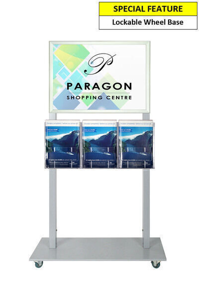 In StockThe Mall Stand is a portable display stand. This is a Single Sided Silver freestanding stand with a A2 Snap Frame and 3 A4 Brochure Holders. It is sturdy and made of Steel and powder Coated in Silver. It is 143cm high which enables you to easily look over it to see beyond the line of sight. The frame is a tamper proof snap frame with a steel backing. The frame remains locked unless bottom, sides then top profiles are opened sequentially. The Acrylic Brochure holders are scratch resistant and have a glass like appearance. The base is a low profile lockable wheel base that has removable wheels. They are ideal for venues and shopping malls to advertise or promote events. They can be used in a variety of indoor or under cover locations for a smart, professional look for your businesses signage and promotions.
