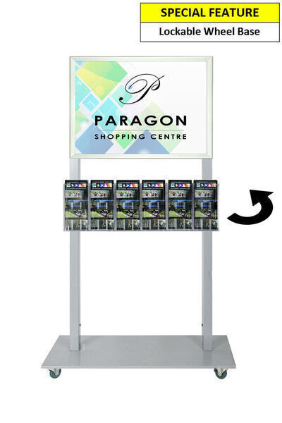 In StockThe Mall Stand is a portable display stand. This is a Double sided Silver freestanding stand with a A2 Snap Frame and 6 DL Brochure Holders on both sides. It is sturdy and made of Steel and powder Coated in Silver. It is 143cm high which enables you to easily look over it to see beyond the line of sight. The frame is a tamper proof snap frame with a steel backing. The frame remains locked unless bottom, sides then top profiles are opened sequentially. The Acrylic Brochure holders are scratch resistant and have a glass like appearance. The base is a low profile lockable wheel base that has removable wheels. They are ideal for venues and shopping malls to advertise or promote events. They can be used in a variety of indoor or under cover locations for a smart, professional look for your businesses signage and promotions.