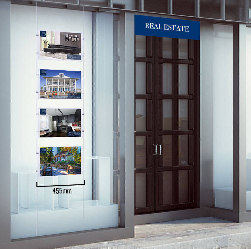 This Window Cable Display, Window Real Estate Displays is a double sided 3mm thick acrylic display attached to a cable system.