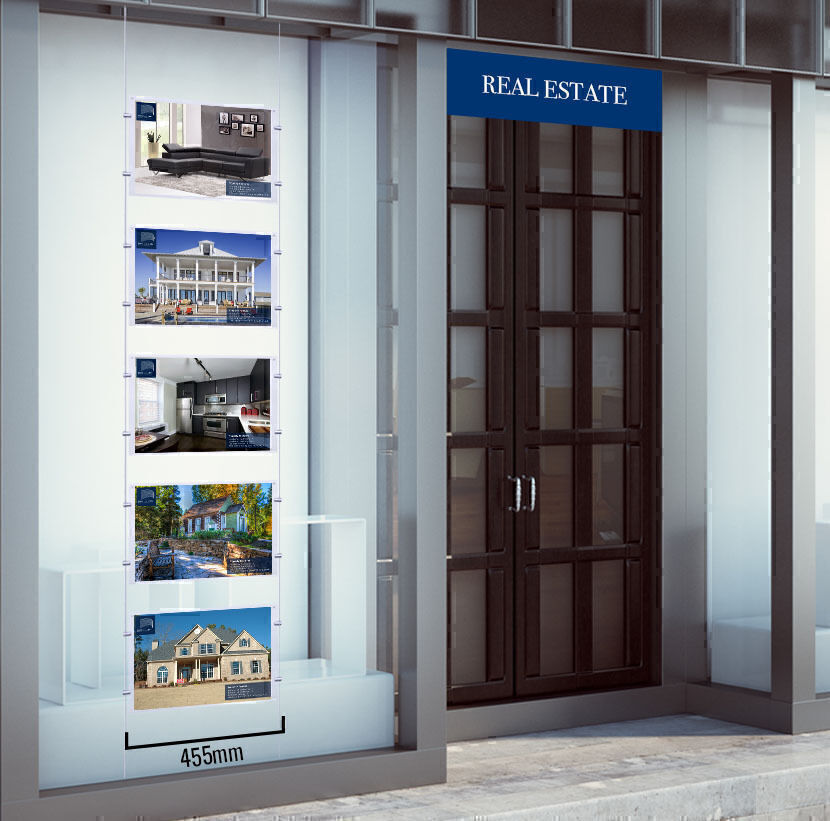 This Window Cable Display, Window Real Estate Displays is a double sided 3mm thick acrylic display attached to a cable system.