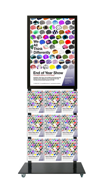 In StockThe Tall Info Stand is a portable display stand. This is a Double Sided freestanding stand with a A1 Poster Display and 9 A4 Brochure Holders on each side. It is sturdy and made of Steel and powder coated in Black. This stand is 1800mm tall and stands out making it visible and prominent. The frame is a tamper proof snap frame with a steel backing. The frame remains locked unless bottom, sides then top profiles are opened sequentially. The base is a low profile lockable wheel base that has removable wheels. They are ideal for venues and shopping malls to advertise or promote events. They can be used in a variety of indoor or under cover locations for a smart, professional look for your businesses signage and promotions.