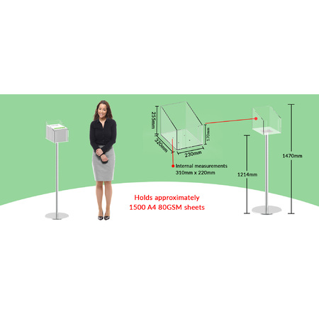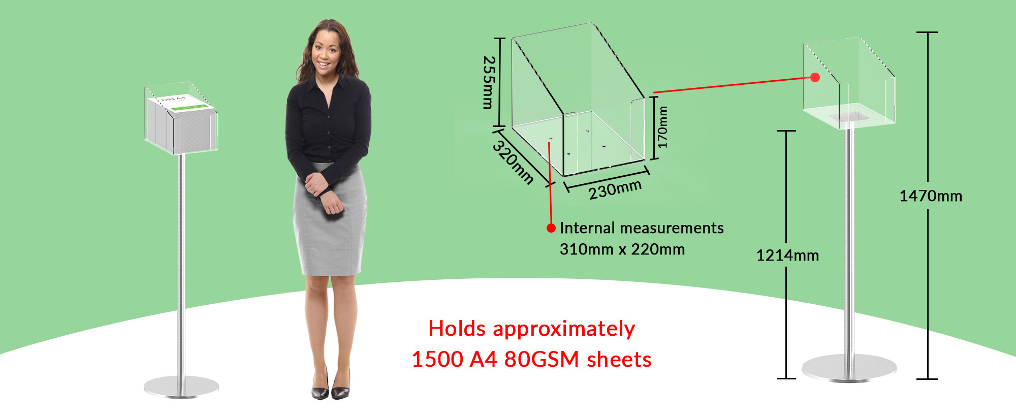 This A4 freestanding Promo Holder has 3mm thick clear Acrylic top clearly displaying the contents of the deep catalogue holder. This A4 pamphlet floor stand can hold A4 (210 x 297mm) literature in Portrait format.