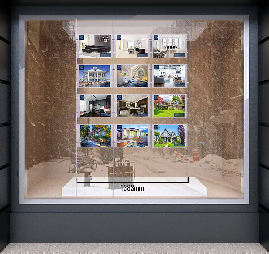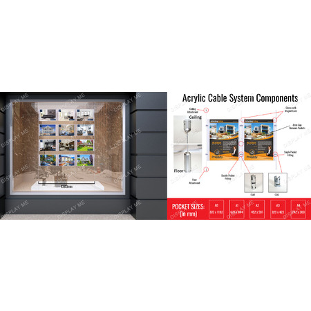 This Window Cable Display, Window Real Estate Displays is a double sided 3mm thick acrylic display attached to a cable system.