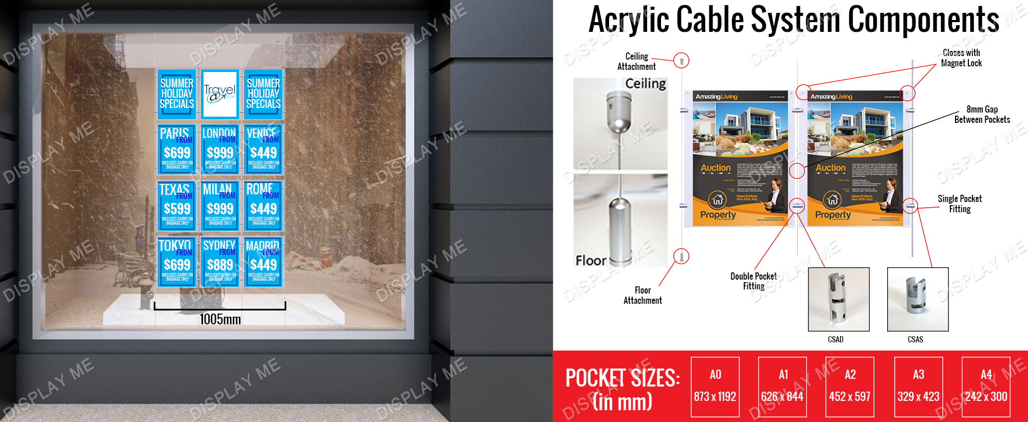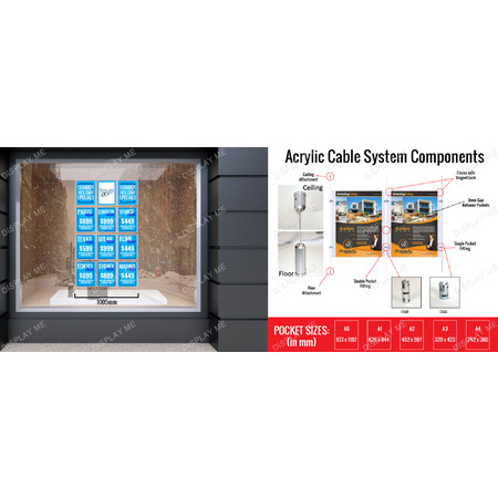 This Window Cable Display, Window Real Estate Displays is a double sided 3mm thick acrylic display attached to a cable system.