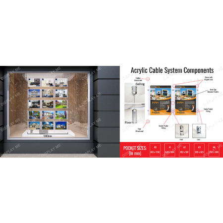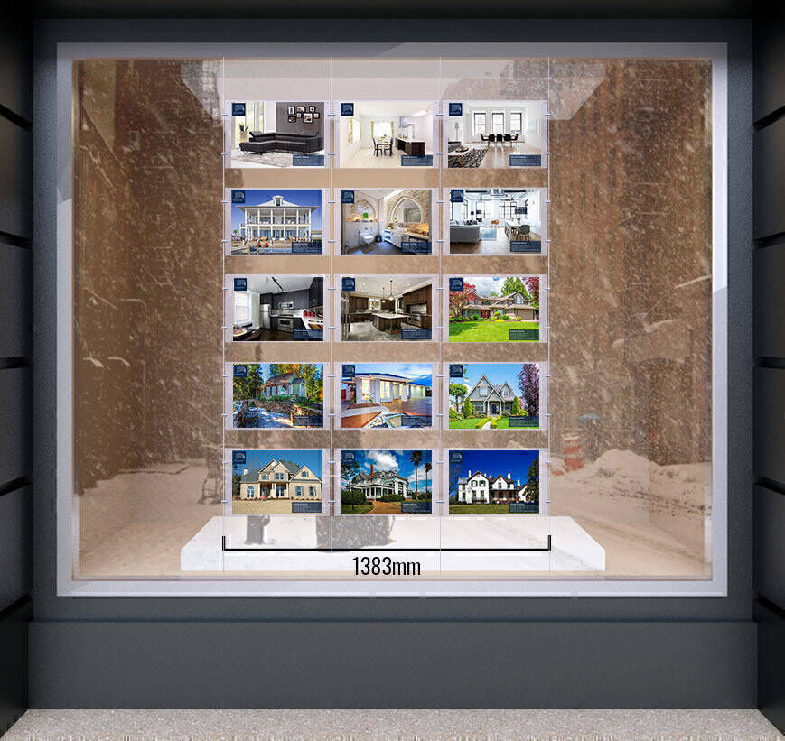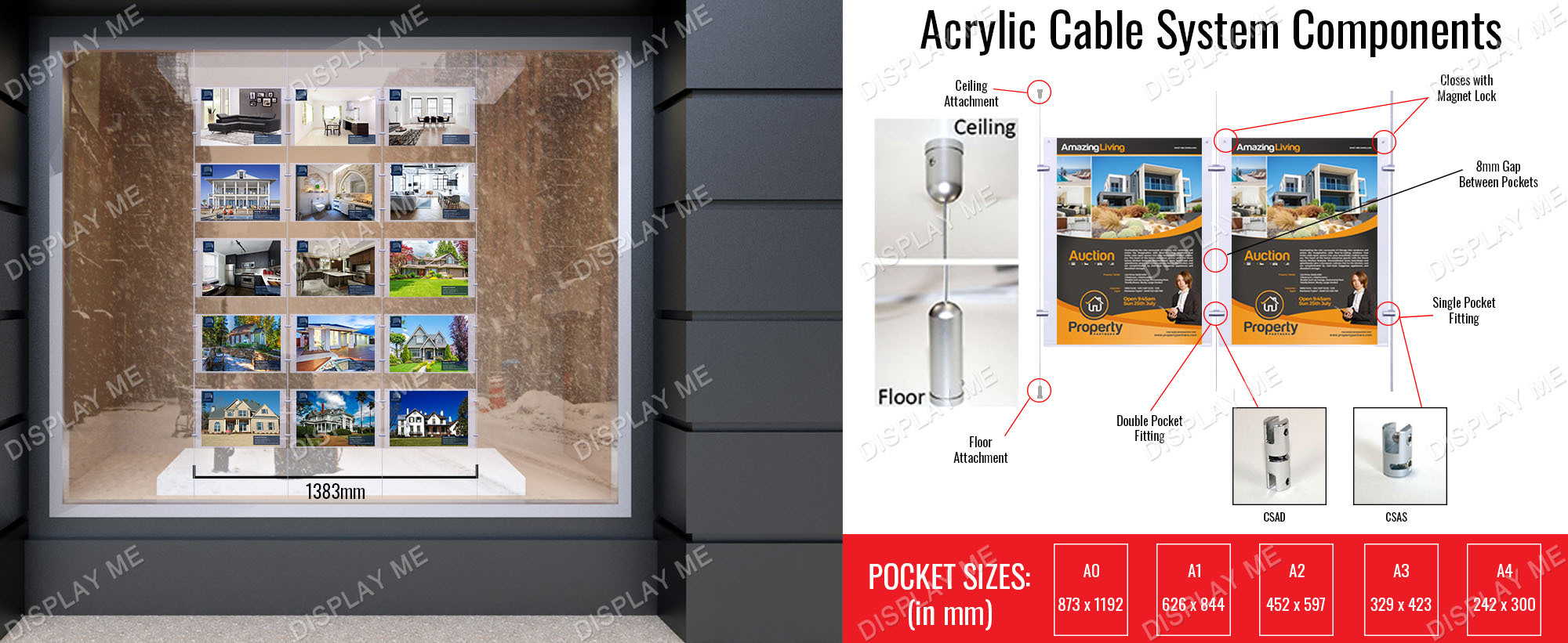 This Window Cable Display, Window Real Estate Displays is a double sided 3mm thick acrylic display attached to a cable system.