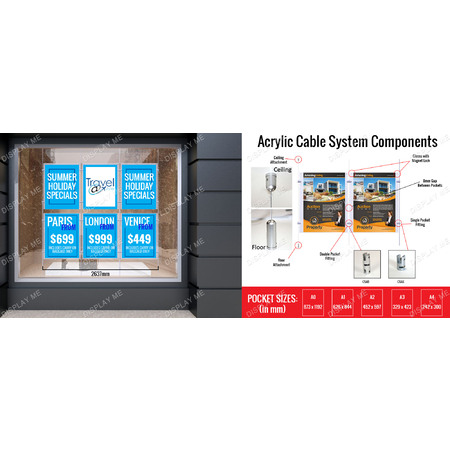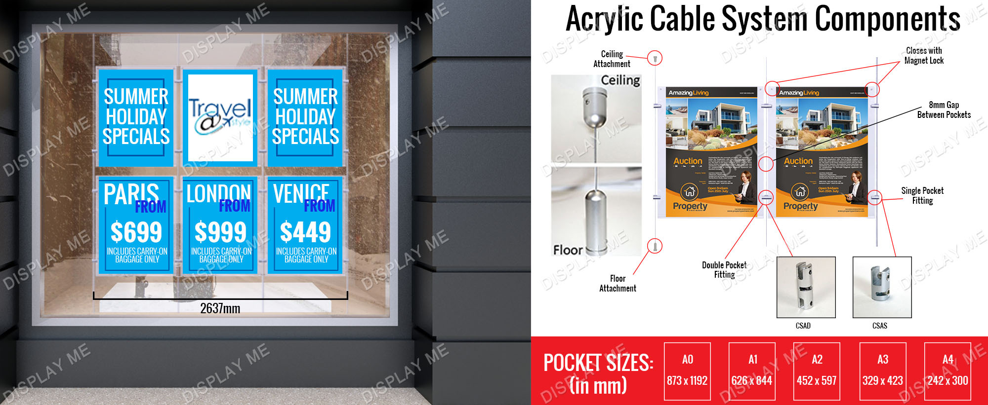 This Window Cable Display, Window Real Estate Displays is a double sided 3mm thick acrylic display attached to a cable system.