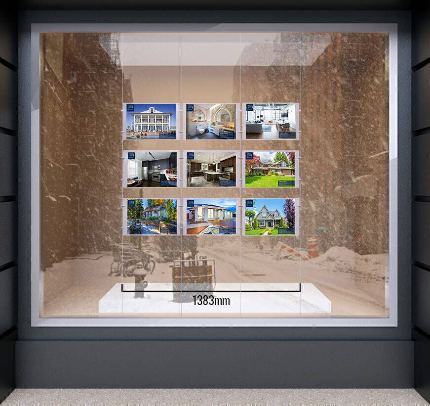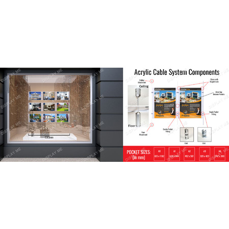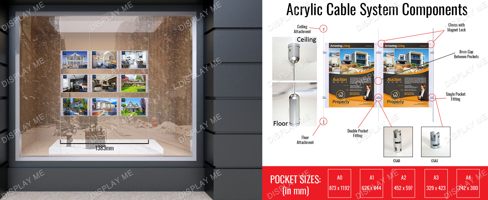 This Window Cable Display, Window Real Estate Displays is a double sided 3mm thick acrylic display attached to a cable system.