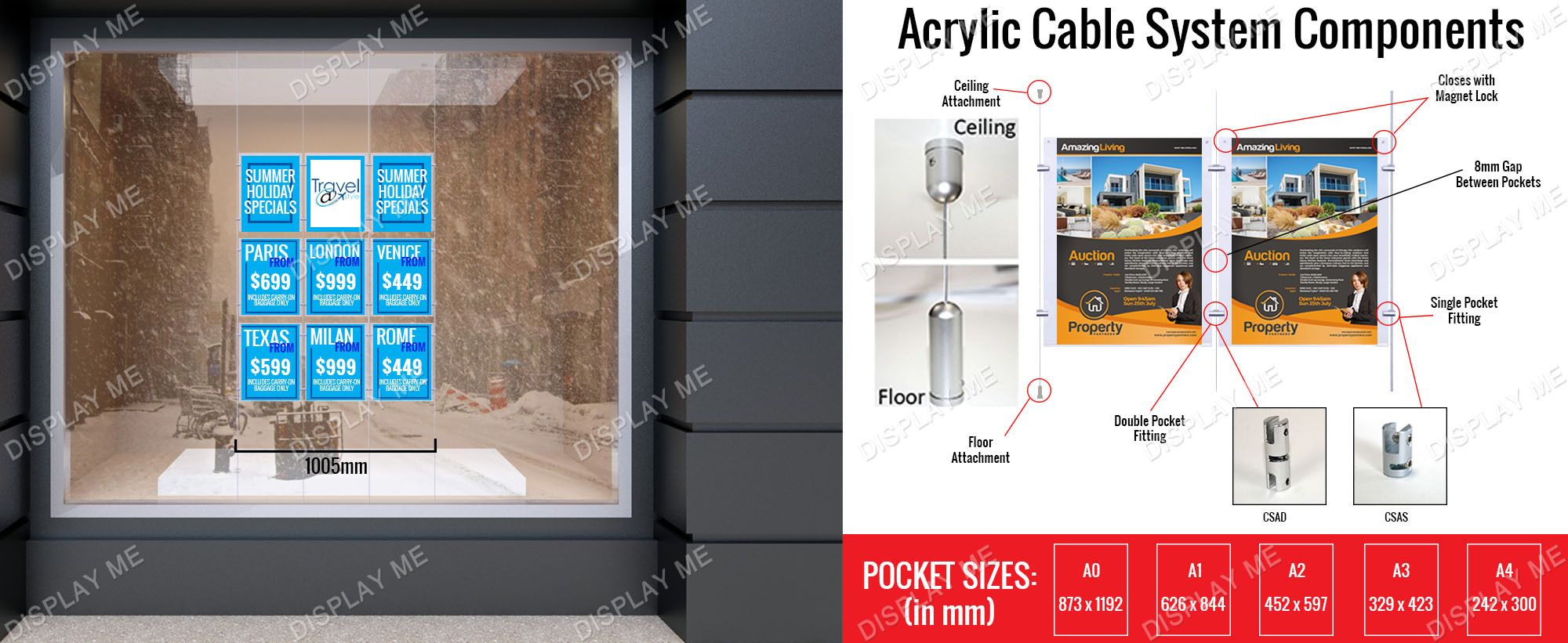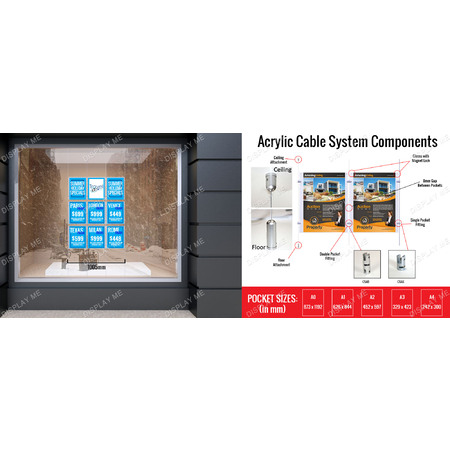 This Window Cable Display, Window Real Estate Displays is a double sided 3mm thick acrylic display attached to a cable system.