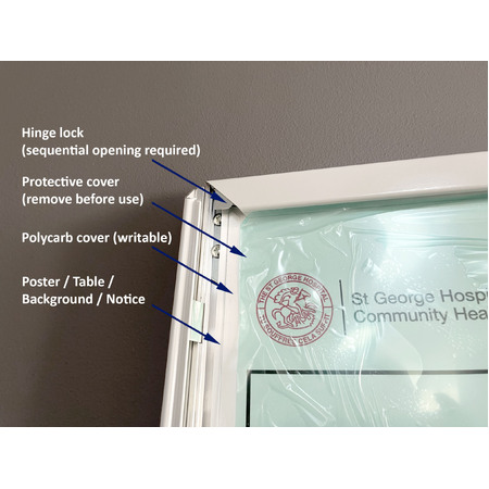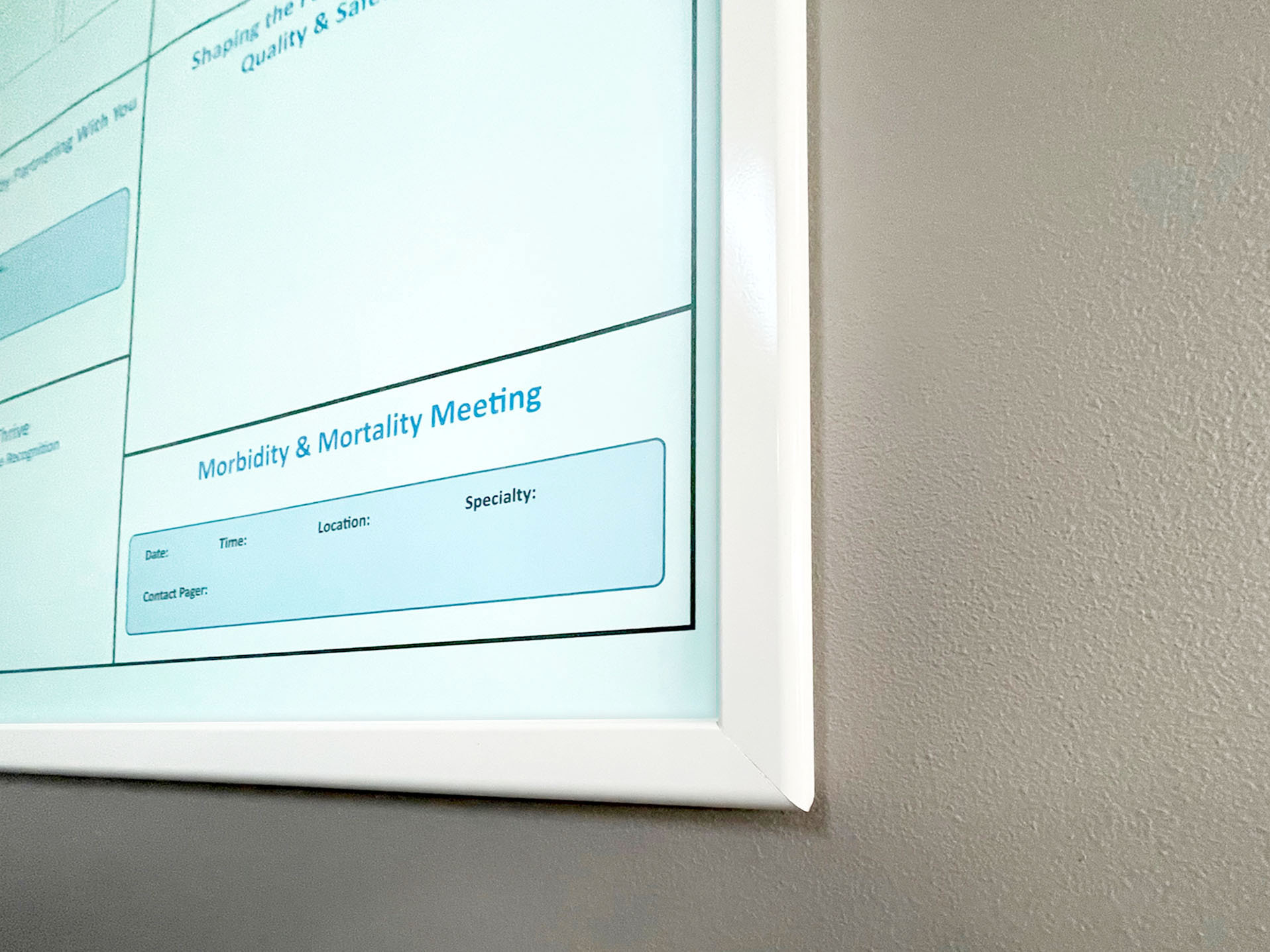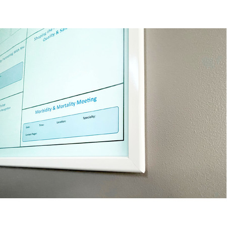 These frames are ideal for hospital patient boards. A poster is inserted into the frame and clear polycarbonate cover is placed over the poster making it easy to coordinate hospital or patient information. It is a great platform to relay all sorts of information for example patient to caregiver and vice versa. Writing on the polycarbonate cover can be wiped clean for various uses and the magnetic backing holds whiteboard markers or magnets.